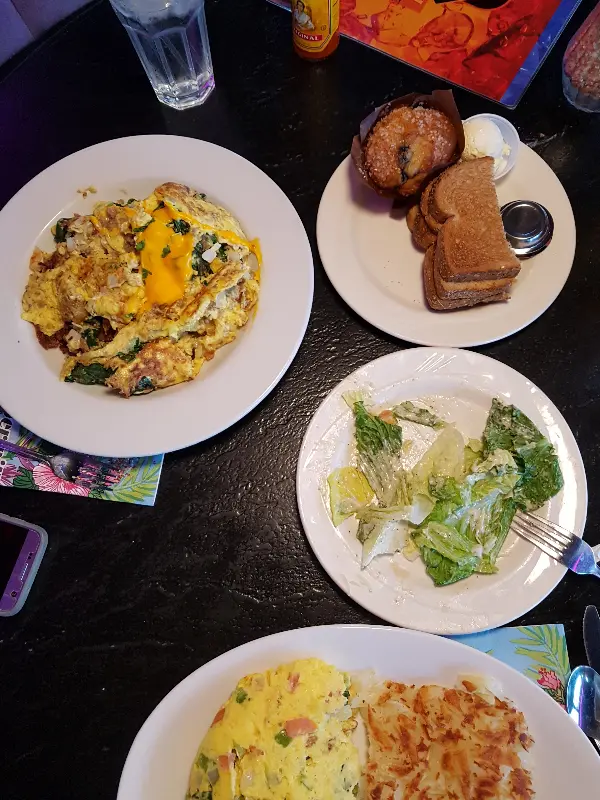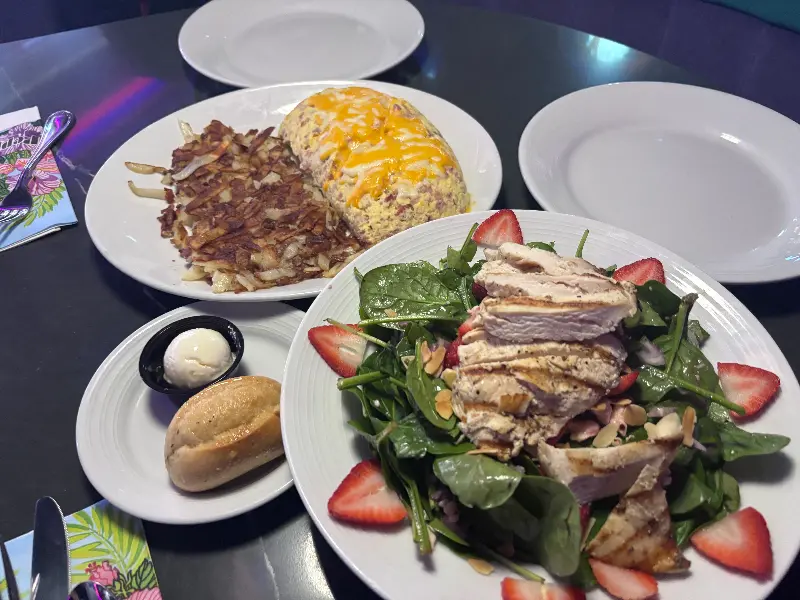 사진에서 보이는 것처럼, 오믈렛은 제 주먹보다 훨씬 컸고, 샐러드 역시 접시 가득 신선한 채소와 스테이크가 담겨 있었습니다. 샐러드에는 싱싱한 야채와 구운 닭가슴살, 그리고 달콤한 딸기가 조화롭게 어우러져 있었습니다. 특히 닭가슴살은 겉은 바삭하고 속은 촉촉하게 구워져, 입안 가득 풍미가 퍼져나갔습니다. 멕시칸 오믈렛은 부드러운 계란 안에 매콤한 멕시칸 소스와 다양한 채소가 가득 들어있어, 느끼함 없이 맛있게 즐길 수 있었습니다. 한 입 먹을 때마다 입안 가득 퍼지는 풍성한 맛은, 왜 이곳이 라스베가스 맛집으로 유명한지 단번에 이해시켜 주었습니다.