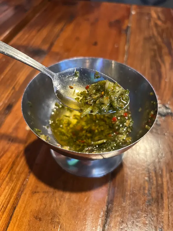 스테이크를 한 입 베어 무는 순간, 입안 가득 퍼지는 육즙과 풍미는 감탄을 자아냈다. 겉은 바삭하고 속은 촉촉하게 구워진 스테이크는 최상급 품질의 소고기를 사용했음을 짐작하게 했다. 함께 제공된 치미추리 소스는 스테이크의 풍미를 더욱 깊게 만들어 주었다.