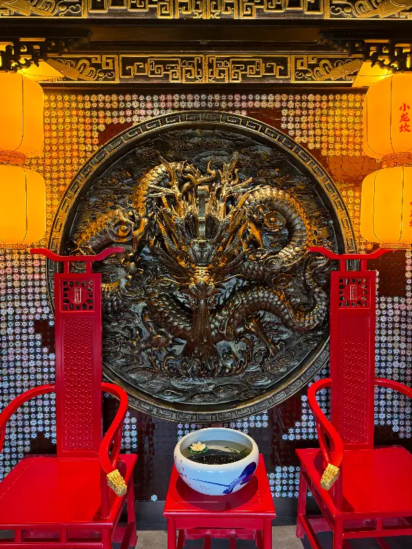 문을 열자마자 눈 앞에 펼쳐진 것은 화려하면서도 웅장한 중국풍 인테리어였다. 붉은색과 금색이 조화롭게 어우러진 공간은 마치 중국의 고대 궁궐에 들어선 듯한 착각을 불러일으켰다. 용을 형상화한 장식과 전통 문양이 새겨진 가구들은 고급스러움을 더했고, 은은하게 빛나는 붉은색 등불은 아늑한 분위기를 자아냈다. 한 리뷰어의 말처럼, “밖에서 보기에도 멋져서 우연히 들렀는데, 안에 들어가니 더 멋지네요!” 라는 감탄사가 절로 나왔다.