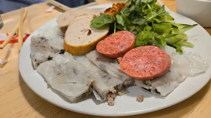 반 꾸온을 주문하려고 했지만, 아쉽게도 저녁 7시쯤에 품절되었습니다. 대신 넴 꾸온, 반 콧, 봇 치엔을 주문했습니다. 모든 요리가 정말 맛있었지만, 볶음밥 가루 케이크(봇 치엔)가 단연 최고였습니다. 겉은 바삭하고 속은 부드러울 정도로 얇은 케이크의 식감은 잊을 수 없는 경험이었습니다. 간장의 짠맛과 신맛이 조금만 덜하면 완벽할 것 같습니다. 미니 팬케이크에는 신선한 새우가 들어 있어 풍미를 더했습니다.