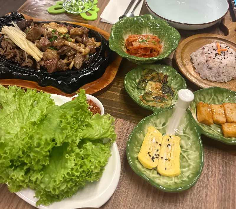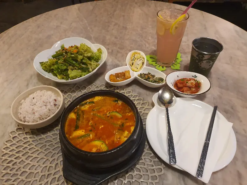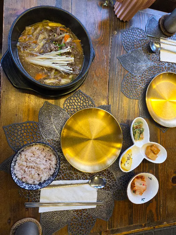 메뉴판을 펼쳐 들자, 익숙한 한식 메뉴들이 눈에 들어옵니다. 된장찌개, 김치찌개, 오징어볶음… 고민 끝에 뚝배기 불고기와 김치찌개를 주문했습니다. 잠시 후, 테이블 위로 정갈하게 차려진 한 상이 펼쳐집니다. 따뜻한 밥과 함께, 보기만 해도 군침이 도는 반찬들.