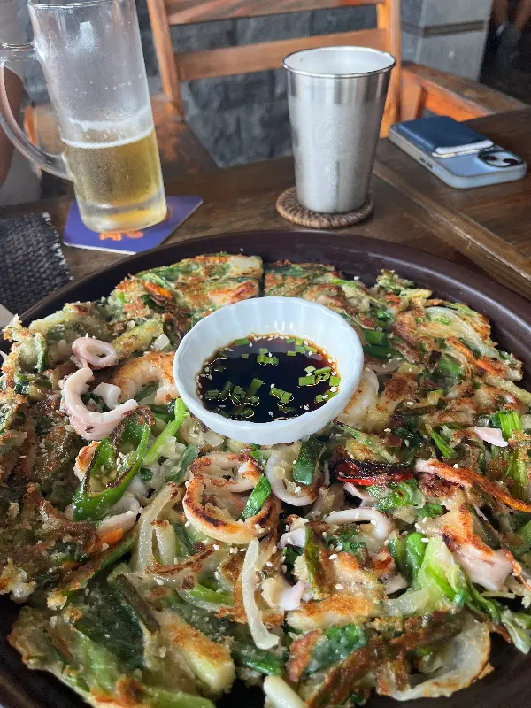 함께 주문한 해물파전은 신선한 해물과 파가 듬뿍 들어가 있어, 씹을 때마다 바다 향이 입안 가득 퍼집니다. 겉은 바삭하고 속은 촉촉한 완벽한 식감. 특히 갓 구워져 나온 따뜻한 해물파전은, 비 오는 날 막걸리 한 잔과 함께 먹으면 더욱 좋을 것 같습니다.
