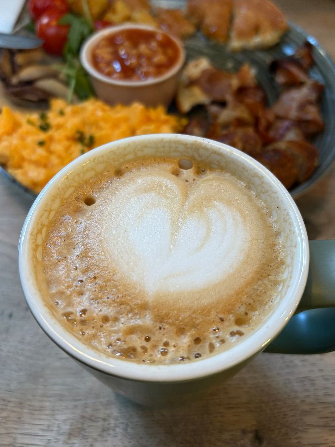 고요하고 아늑한 공간에서 메뉴판을 받아 들었습니다. 런던에서의 첫 끼니인 만큼 신중하게 고민하던 중, 주변 테이블에서 피어오르는 고소한 커피 향과 함께 하트 모양의 라테아트가 그려진 잔이 눈에 들어왔습니다. 왠지 모르게 따뜻한 위로를 건네는 듯한 이 커피 한 잔은 이른 아침의 피로를 씻어내기에 충분해 보였습니다. KOZZEE의 커피는 단순히 잠을 깨우는 음료가 아니라, 그 자체로 예술이자 힐링이었습니다.