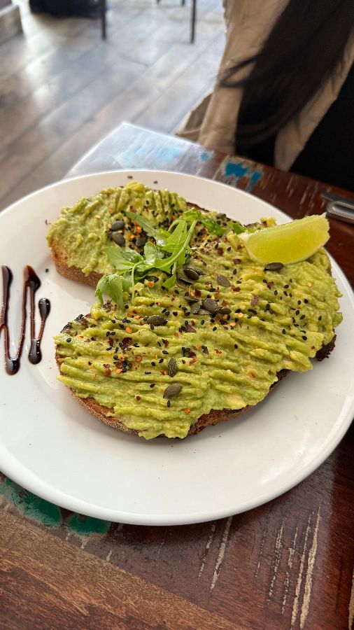 건강하고 깔끔한 맛을 선호하는 분들을 위해 아보카도 토스트도 훌륭한 선택지였습니다. 갓 구운 토스트 위에 신선한 아보카도를 듬뿍 올려 낸 이 메뉴는 보는 것만으로도 상큼함이 느껴졌습니다. 초록빛 아보카도 퓨레 위로 뿌려진 호박씨와 검은깨, 그리고 약간의 붉은 고춧가루는 시각적인 아름다움뿐만 아니라 고소함과 미묘한 매콤함을 더해 맛의 깊이를 더했습니다. 얇게 썰린 라임 한 조각은 신선한 산미를 더해 아보카도의 풍미를 한층 끌어올렸죠.