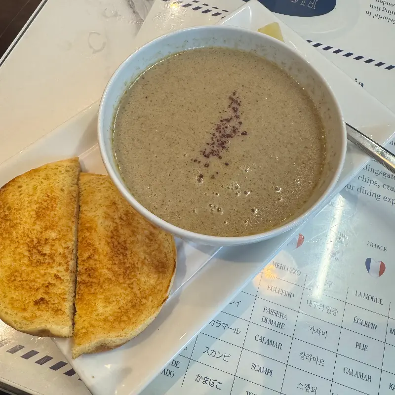 가장 먼저 나온 스프는 차가운 바람에 살짝 얼었던 몸을 녹여주기에 충분했습니다. 부드러운 질감과 은은한 풍미가 입안 가득 퍼지면서, 본격적인 식사를 위한 준비 운동을 하는 기분이었습니다. 함께 나온 토스트는 바삭하게 구워져 스프에 찍어 먹으니 환상의 조합이었습니다.