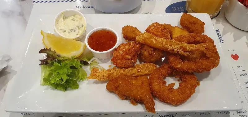 오픈 시간에 맞춰 도착한 덕분에 웨이팅 없이 바로 자리에 앉을 수 있었습니다. 가게 내부는 깔끔하고 쾌적했으며, 직원분들의 친절한 미소가 인상적이었습니다. 밝은 표정으로 맞이해주시는 모습에, 맛있는 식사를 할 수 있으리라는 기대감이 더욱 커졌습니다. 한쪽 벽면에는 Fishoria의 역사를 보여주는 사진들이 걸려 있었는데, 오랜 시간 동안 사랑받아온 맛집이라는 것을 짐작할 수 있었습니다.