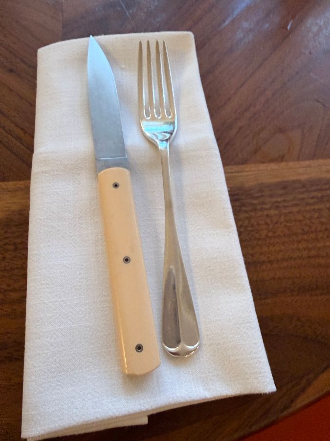 깔끔하게 세팅된 테이블 위의 나이프와 포크. 베이지색 손잡이의 나이프가 특히 인상적입니다.
