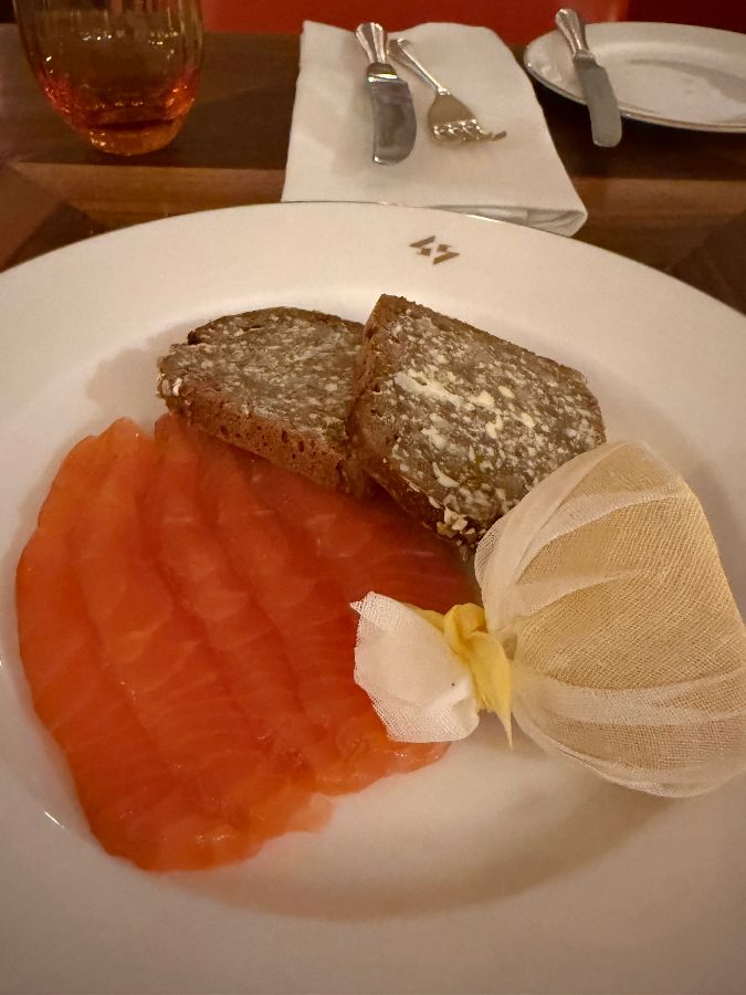 신선한 연어 슬라이스와 레몬이 곁들여진 스타터. 깔끔하고 정갈한 플레이팅이 돋보입니다.