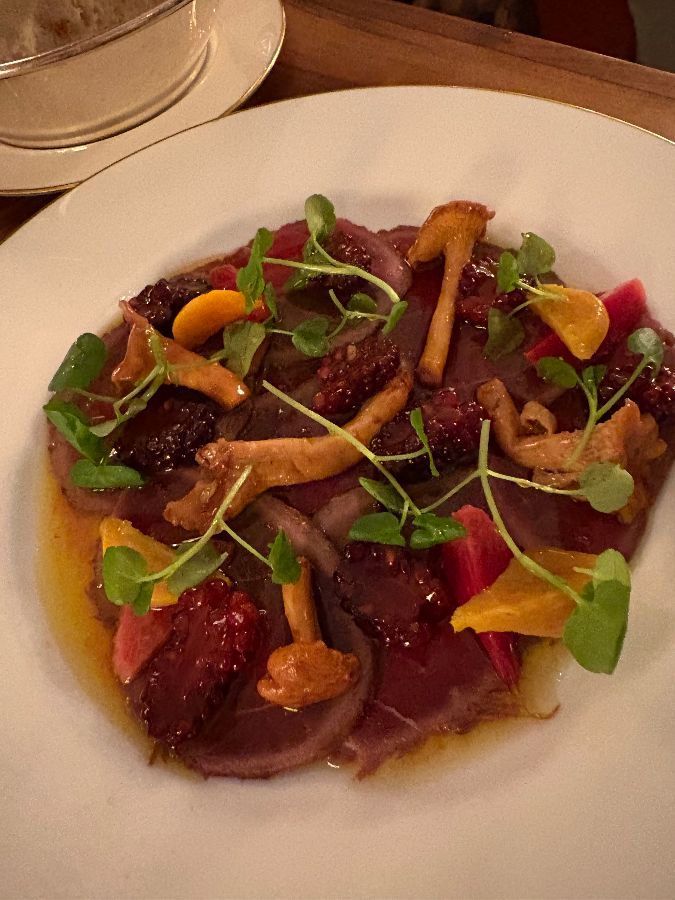 또 다른 스타터로는 얇게 썬 고기 위에 버섯과 허브, 오렌지 조각 등이 어우러진 요리가 있습니다. 다채로운 색감과 섬세한 플레이팅은 시각적인 즐거움을 선사하며, 각각의 재료가 조화롭게 어우러져 복합적인 맛을 냅니다. 이러한 스타터들은 메인 요리로 넘어가기 전 입맛을 돋우는 완벽한 역할을 합니다.