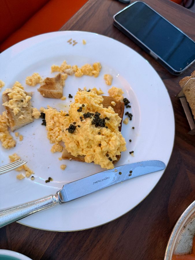 캐비어가 올려진 스크램블 에그와 토스트. 고급스러운 아침 식사 메뉴입니다.