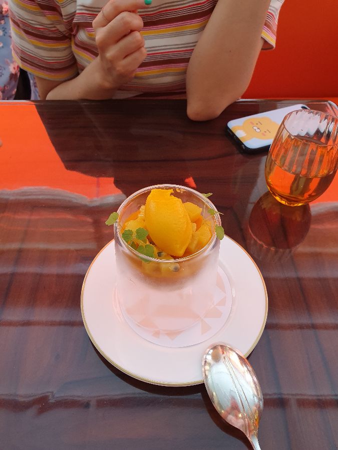 상큼한 망고 셔벗 디저트. 시원하고 달콤한 맛이 식사의 마무리를 장식합니다.