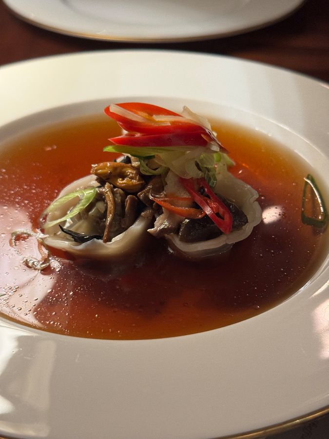 홀을 가득 채운 은은한 주황색 조명은 마치 촛불처럼 따뜻한 온기를 발산하며, 테이블마다 가지런히 놓인 고급스러운 식기들은 곧 펼쳐질 미식의 향연을 기대하게 만듭니다. 특히 잘 닦인 나이프와 포크, 그리고 깔끔한 냅킨은 이곳의 세심한 서비스와 품격을 한눈에 보여줍니다. 이런 분위기 덕분에 대부분의 현지인들은 어느 정도 드레스코드를 갖추고 방문하지만, 여행객 차림이라도 전혀 개의치 않고 편안한 서비스를 받을 수 있다는 점은 이 곳의 유연함을 보여줍니다.