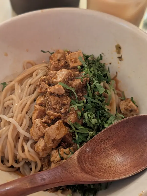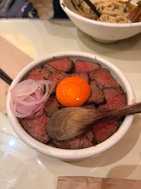 메인 메뉴로 나온 면 요리는 솔직히 아쉬웠다. 국물 맛은 평범했고, 면발은 뭉쳐져 있었다. 고기 양도 적어서, 전체적으로 만족스럽지 못했다. 다음번에 방문한다면 다른 메인 메뉴를 선택해봐야겠다는 생각을 했다. 이미지 속 먹음직스러운 면 요리의 비주얼과는 조금 달라서 아쉬움이 남았다.