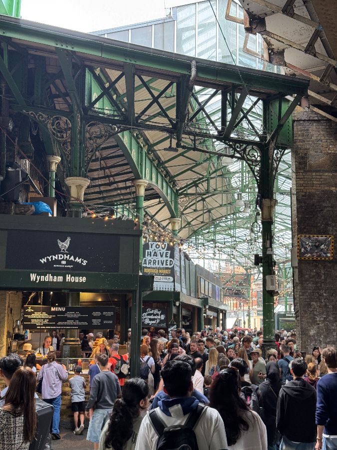 오래된 철골 구조물 아래, 수많은 인파가 오가는 버로우마켓의 활기찬 풍경입니다. 다양한 상점들이 불을 밝히고 손님들을 맞이하며, 런던의 옛 정취와 현대적인 활력이 공존하는 특별한 분위기를 연출합니다.
