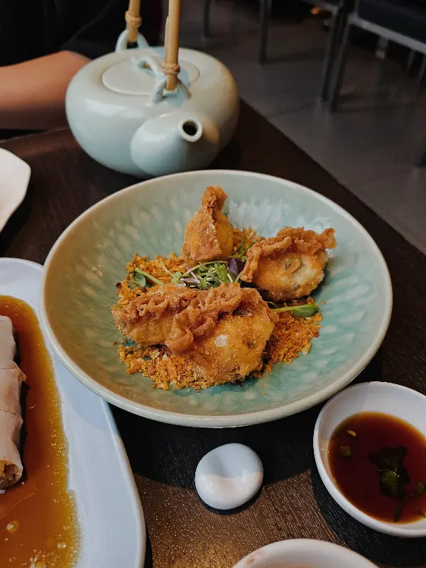 저희는 테이스팅 메뉴를 선택했습니다. 메뉴가 나올 때마다 이전 요리를 뛰어넘는 듯한 놀라움을 금치 못했습니다. 딤섬부터 메인 요리까지, 모든 음식에서 신선한 재료와 정성이 느껴졌습니다. 특히 바삭하게 튀겨진 소프트쉘 크랩은 잊을 수 없는 맛이었습니다. 겉은 바삭하고 속은 촉촉한 크랩의 풍미가 입안 가득 퍼져 나갔습니다. 매콤한 가지와 싱가포르식 볶음면 또한 훌륭했습니다.