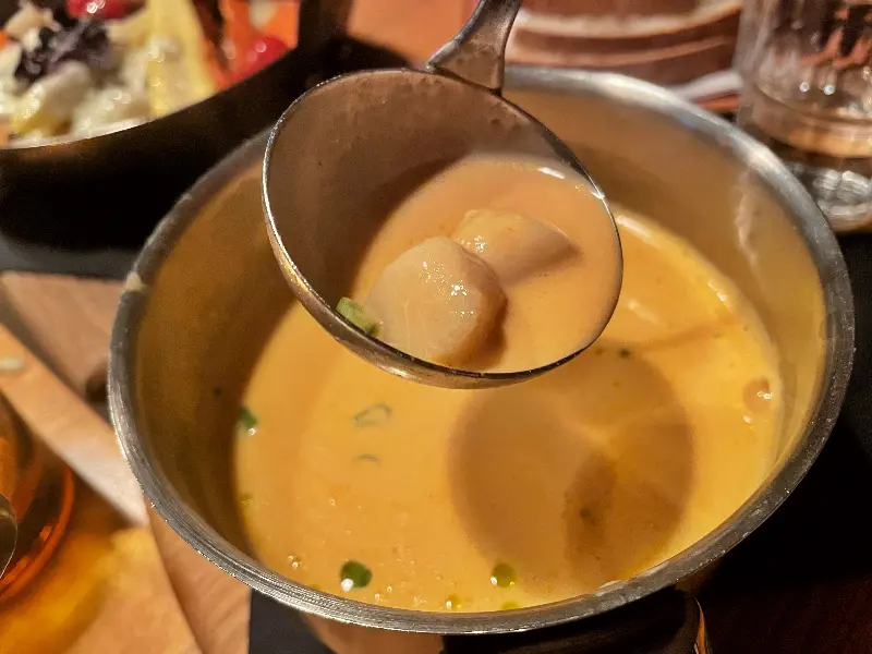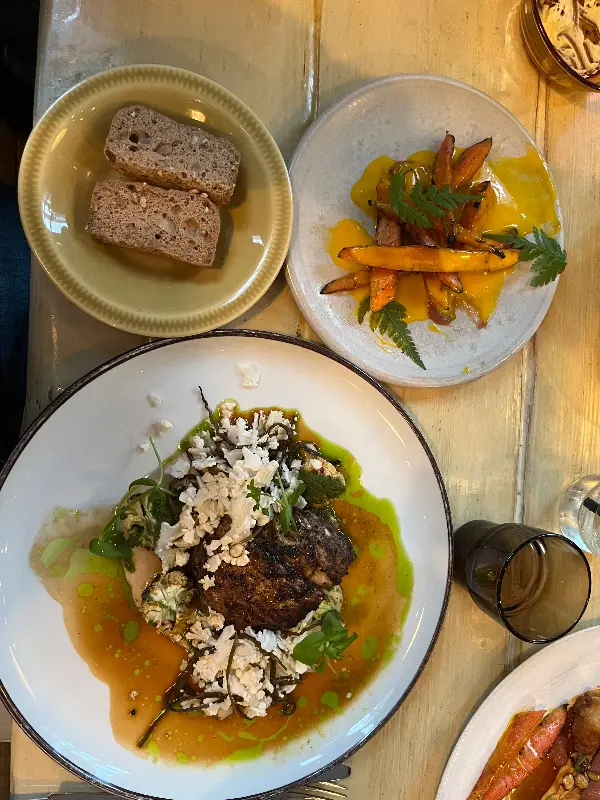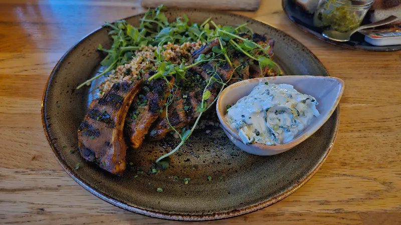 양갈비 외에도 다양한 메뉴가 준비되어 있었습니다. 신선한 생선 요리는 물론, 아이들을 위한 오리 가슴살 스테이크도 있었습니다. 4코스 생선 메뉴는 어른들에게, 오리 가슴살은 아이들에게 최고의 선택이었죠. 모든 음식이 훌륭했지만, 특히 그날 잡은 대구와 새우, 가리비가 들어간 해산물 수프는 정말 인상적이었습니다.