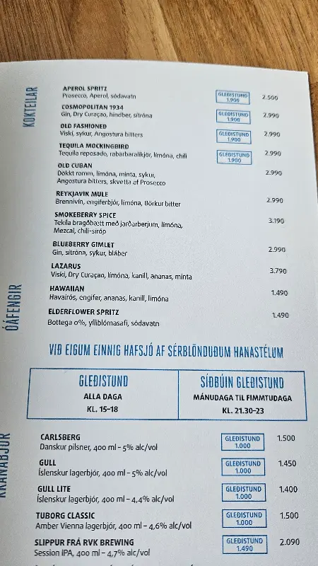 다양한 메뉴 옵션을 제공하는 Slippbarinn의 메뉴판. 칵테일부터 메인 요리, 디저트까지 풍성하다.
