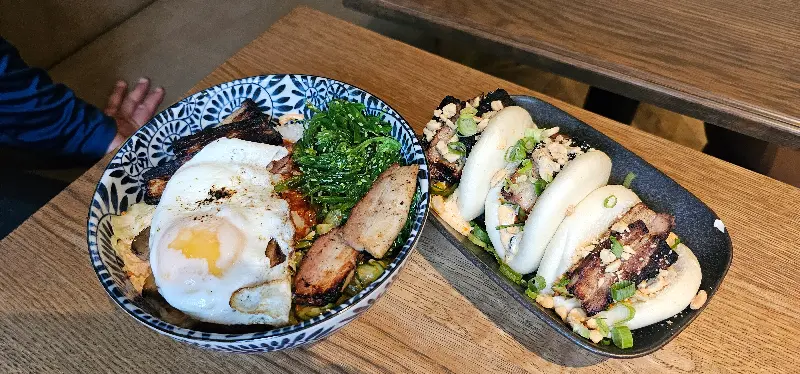 잠시 후, 주문한 음식이 나왔다. 돼지고기 비빔밥은 신선한 채소와 돼지고기가 조화롭게 어우러져 있었고, 삼겹살 바오 번은 윤기가 흐르는 빵 안에 촉촉한 삼겹살이 가득 들어 있었다. 한눈에 보기에도 먹음직스러운 모습에 기대감이 더욱 커졌다.