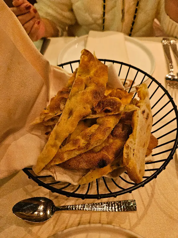 자리에 앉자마자 따뜻하게 구워져 나온 식전빵은, 은은한 올리브 오일 향과 함께 우리의 미각을 깨웠습니다. 겉은 바삭하고 속은 촉촉한 빵을 뜯어 올리브 오일에 살짝 찍어 먹으니, 그 풍미가 입안 가득 퍼져나갔습니다. 갓 구운 빵의 따뜻함과 고소함은, 앞으로 펼쳐질 미식 경험에 대한 기대감을 한껏 끌어올렸습니다.