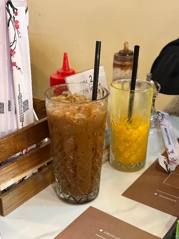무엇보다 놀라웠던 것은 고기의 양이었습니다. 면보다 고기가 더 많을 정도로 푸짐하게 담겨 나온 분짜는, 마치 고기를 먹다 배부를 정도였습니다. 신선한 야채와 함께 곁들여 먹으니, 느끼함은 전혀 없고 오히려 깔끔하고 상큼한 맛이 입안 가득 퍼졌습니다. 갓 짜낸 듯한 오렌지 주스 또한 신선함을 더했습니다.