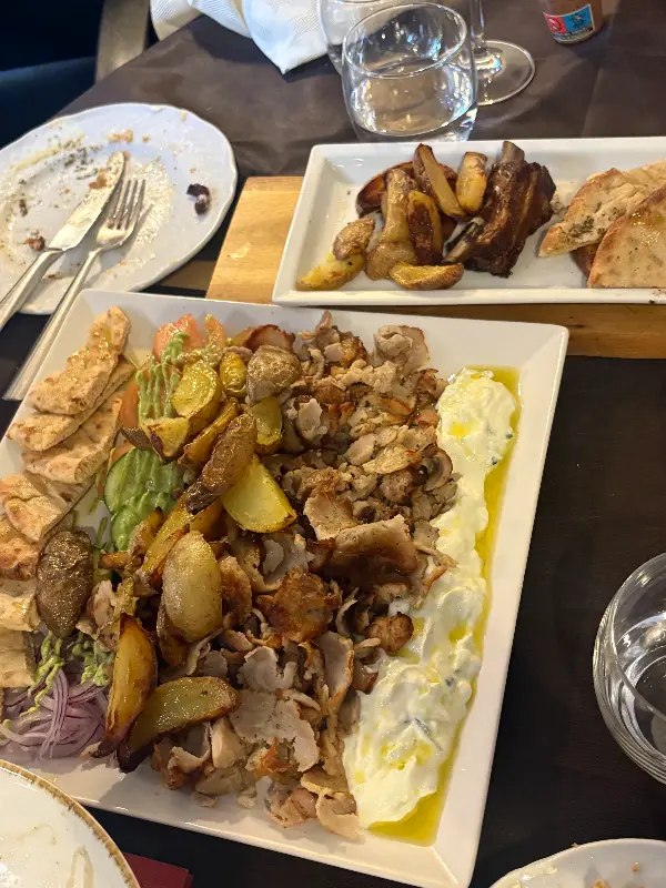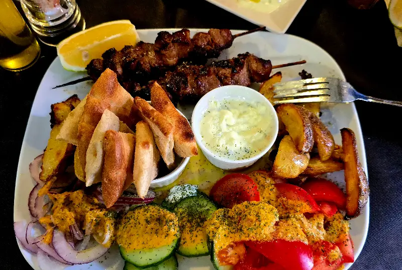 다음으로 맛본 양고기 수블라키(Souvlaki)는 육즙이 풍부하고 부드러웠습니다. 숯불 향이 은은하게 느껴지는 양고기는 쯔란 등의 향신료 없이도 특유의 풍미를 자랑했습니다. 곁들여 나온 구운 야채와 함께 먹으니 더욱 풍성한 맛을 느낄 수 있었습니다.