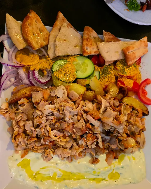 푸짐하게 담긴 그리스 요리, 신선한 재료들의 조화가 돋보입니다.