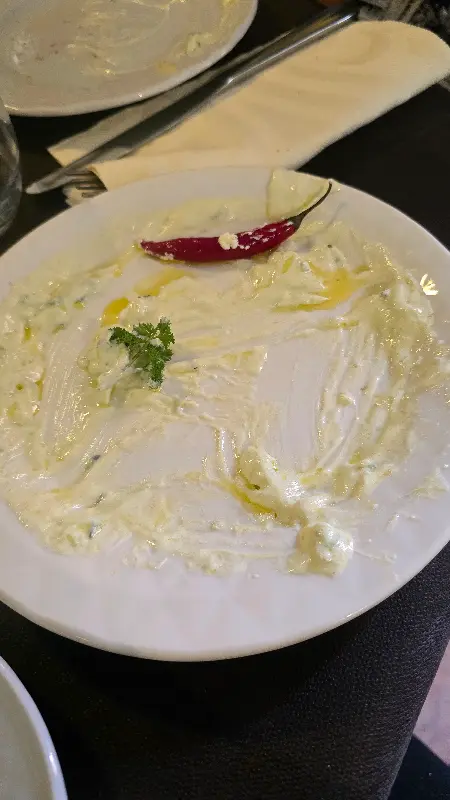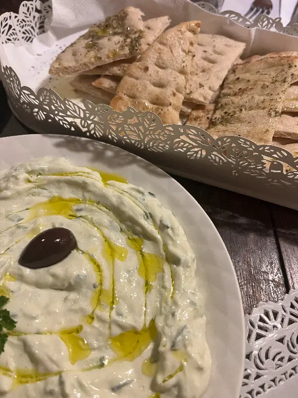 가장 먼저 맛본 음식은 차지키(Tzatziki)였습니다. 신선한 오이와 마늘, 요거트를 사용하여 만든 차지키는 부드럽고 상큼한 맛이 일품입니다. 갓 구운 빵에 듬뿍 찍어 먹으니 입안 가득 퍼지는 풍미가 식욕을 돋우었습니다.