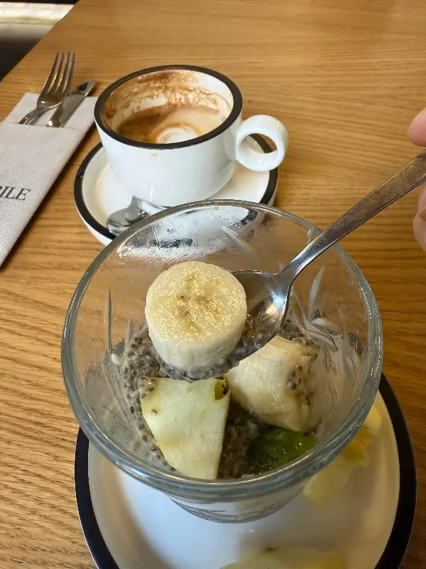 가장 먼저 맛본 치아씨드 볼은 신선한 과일과 치아씨드의 조화가 돋보이는 메뉴였다. 바나나, 키위, 사과 등 다양한 과일이 듬뿍 들어있어 상큼함을 더했고, 톡톡 터지는 치아씨드의 식감은 재미를 더했다. 달콤하면서도 건강한 맛은 아침 식사로 손색이 없었다. 사진에서 보이는 것처럼, 스푼으로 떠올린 한 입 가득한 과일과 치아씨드는 보기만 해도 기분이 좋아진다.