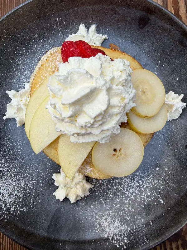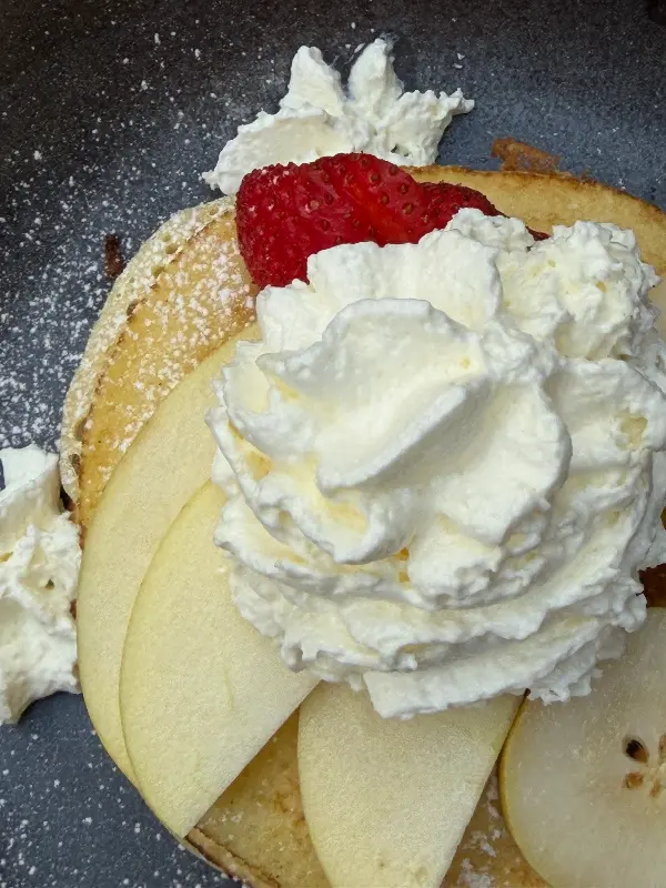 핫케이크 위에 올려진 휘핑크림과 딸기, 사과의 조화는 달콤함을 더해준다.