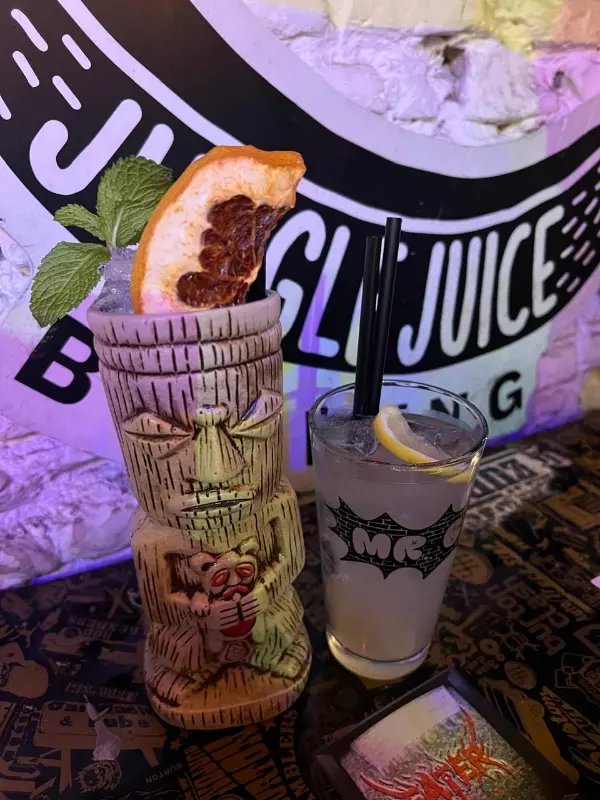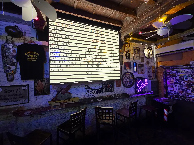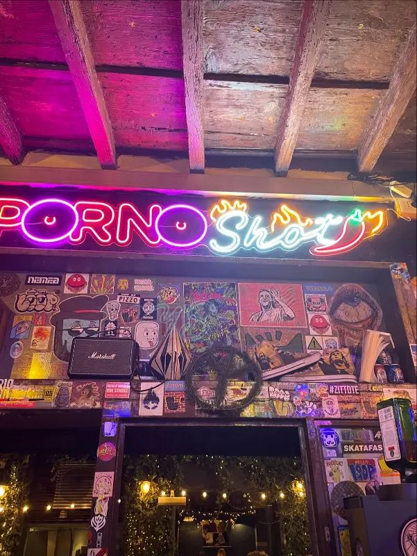 펍 내부는 다양한 스티커와 그림으로 가득 채워져 있었습니다. 벽에는 낙서처럼 보이는 그림들이 자유롭게 그려져 있었고, 천장에는 형형색색의 조명이 빛을 발하고 있었습니다. 언뜻 보면 어수선해 보일 수도 있지만, 이 모든 요소들이 조화롭게 어우러져 독특하고 개성 넘치는 분위기를 자아냅니다. 이미지에서 보이는 것처럼, 입구부터 강렬한 인상을 줍니다. 네온사인 간판은 펑키한 느낌을 더하고, 다양한 스티커로 뒤덮인 벽면은 자유분방한 분위기를 연출합니다.