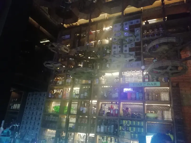 벽을 가득 채운 술병들은 단순한 장식을 넘어, 이 공간의 정체성을 드러내는 듯했습니다. 나무 격자 프레임 안에 정갈하게 진열된 술병들은 마치 잘 정돈된 서재의 책들처럼, 각자의 이야기를 담고 있는 듯했습니다. 푸른색과 녹색의 조명이 술병들을 비추며 신비로운 분위기를 연출했고, 천장에 매달린 독특한 장식물들은 시선을 사로잡았습니다.