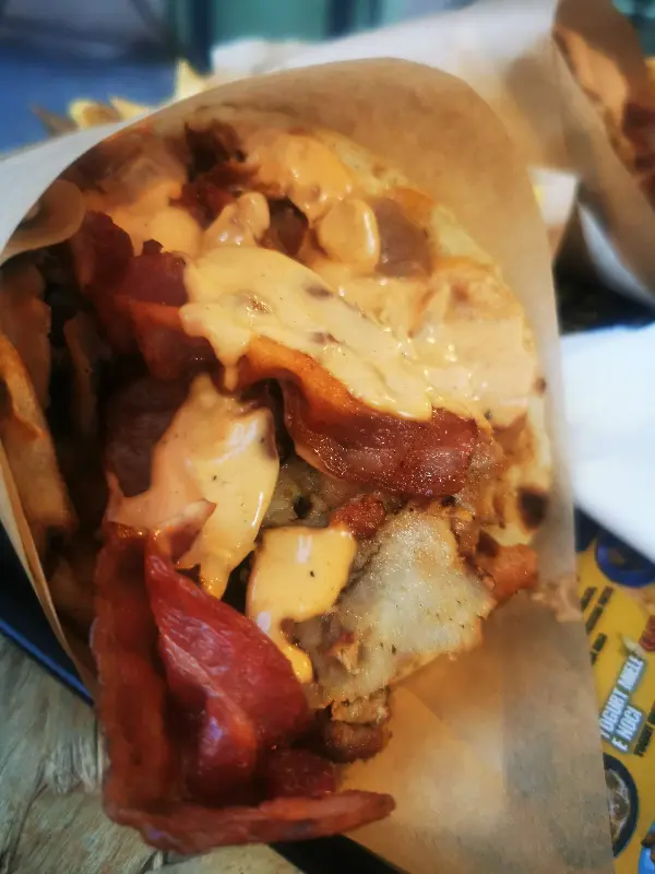 종이 포장지 안에서 푸짐하게 담긴 피타 자이로의 모습. 윤기가 흐르는 베이컨과 소스가 입맛을 자극합니다.