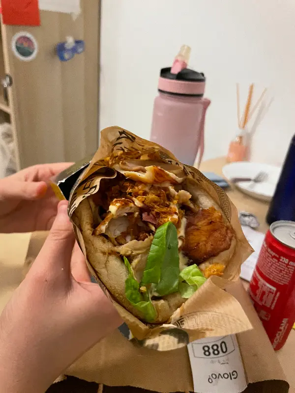 피타 빵 안에 고기와 채소, 소스가 가득 들어간 모습. 푸짐한 양을 자랑합니다.
