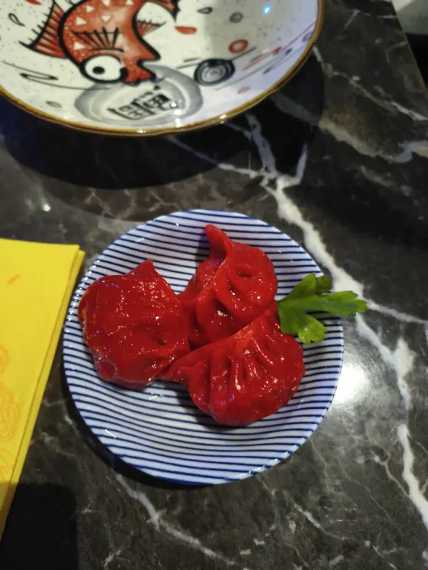 보기만 해도 군침이 도는 붉은색 만두, 섬세한 주름에서 장인의 손길이 느껴집니다. 신선한 재료와 정성이 가득 담긴 맛은 잊을 수 없는 미식 경험을 선사합니다.