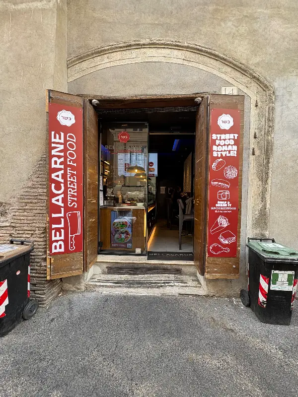 로마의 숨결이 느껴지는 유대인 지구, 그 좁은 골목길을 따라 걷다 보면 특별한 맛집, Bellacarne이 모습을 드러냅니다. 붉은색 간판에 적힌 ‘BELLACARNE STREET FOOD’라는 문구가 발길을 멈추게 하죠. 문을 활짝 열어놓은 모습에서 느껴지는 활기찬 기운은 마치 오래된 친구를 만나는 듯한 반가움을 선사합니다.
