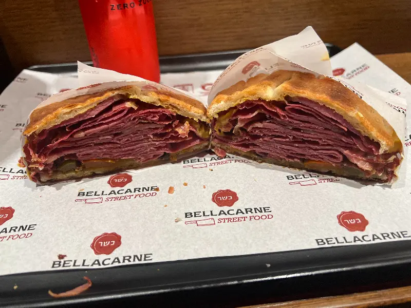 Bellacarne은 코셔 레스토랑으로, 이탈리아식 델리 샌드위치를 전문으로 합니다. 코셔 푸드라는 특별함에 이끌려 방문했지만, 그 맛은 기대를 훨씬 뛰어넘었습니다. 메뉴를 살펴보니 파니니, 피타, 샐러드 등 다양한 선택지가 있었고, 원하는 재료를 직접 골라 나만의 샌드위치를 만들 수도 있다는 점이 매력적이었죠. 카운터 뒤에서 분주하게 움직이는 젊은 직원들의 모습은 마치 활기 넘치는 영화의 한 장면 같았습니다. 그들은 음식에 대한 지식이 풍부했고, 손님들에게 친절하게 메뉴를 설명해주는 모습에서 프로페셔널함이 느껴졌습니다.