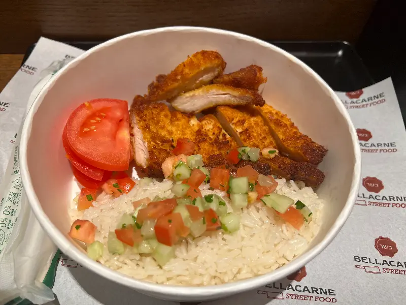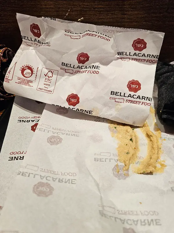 물론 Bellacarne에서 모든 메뉴가 만족스러웠던 것은 아닙니다. 팔라펠은 아쉬움이 남았습니다. 팔라펠 패티는 세 개밖에 되지 않았고, 겉은 타서 말라붙어 있었으며, 차가운 상태였습니다. 마치 전자레인지에 살짝 데운 듯한 느낌이었죠. 게다가 가격도 너무 비쌌습니다. 주문을 받는 직원의 태도 또한 친절하다고는 할 수 없었습니다. 팔라펠을 제외한 다른 메뉴들은 훌륭했지만, 팔라펠은 개선이 필요해 보입니다.