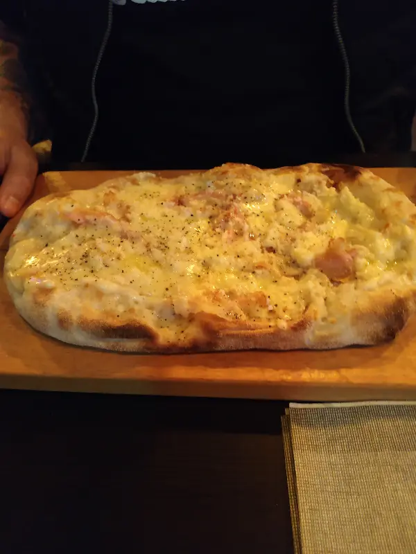 메뉴는 음료에 중점을 두고 있었지만, 애피타이저, 메인 요리, 사이드 메뉴, 디저트까지 다양하게 준비되어 있었습니다. 특히 핀사 알라 카르보나라는 꼭 먹어봐야 한다는 추천에 망설임 없이 주문했습니다. 얇고 바삭한 도우 위에 올려진 카르보나라 소스는 환상적인 맛을 자랑했습니다. 입안 가득 퍼지는 고소함과 짭짤함의 조화는 잊을 수 없는 미식 경험을 선사했습니다.