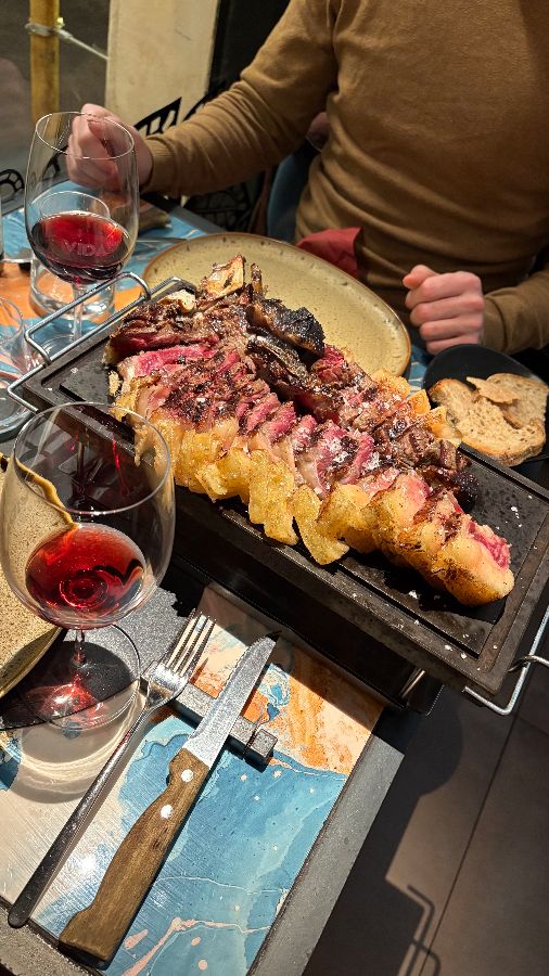 뜨거운 돌판 위에서 지글지글 소리를 내며 나오는 피오렌티나 스테이크. 먹음직스러운 굽기와 육즙 가득한 단면이 인상적입니다.