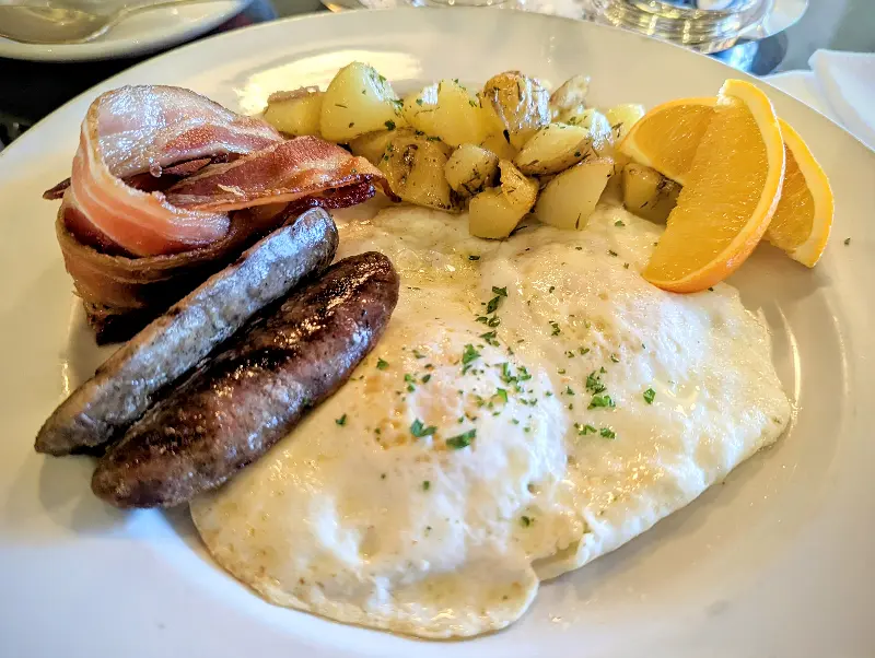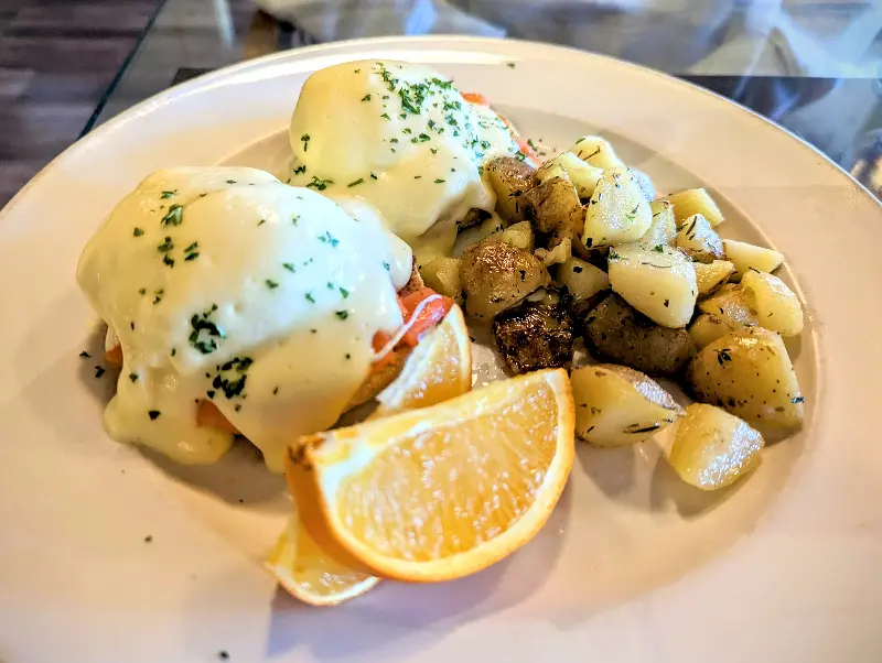 브런치 메뉴 중 하나인 에그 베네딕트는 촉촉한 잉글리시 머핀 위에 햄과 수란을 올리고, 부드러운 홀렌다이즈 소스를 듬뿍 뿌려 제공됩니다. 신선한 오렌지 조각과 함께 곁들여 먹으면 상큼함이 더해져 더욱 맛있게 즐길 수 있습니다. 겉은 바삭하고 속은 촉촉한 감자 또한 훌륭한 조화를 이룹니다.