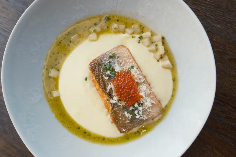 이미지 속 요리는, 흰색 소스 위에 올려진 구운 생선 요리로, 붉은색 알이 포인트로 더해져 식욕을 자극합니다. 소스 주변에는 잘게 썰린 채소가 흩뿌려져 있어, 신선함을 더합니다. 한 입 맛보는 순간, 입 안 가득 퍼지는 풍미는 그야말로 황홀경에 빠지게 했습니다. 신선한 재료 본연의 맛을 최대한 살리면서도, 셰프의 독창적인 해석이 더해져 잊을 수 없는 맛을 선사했습니다.