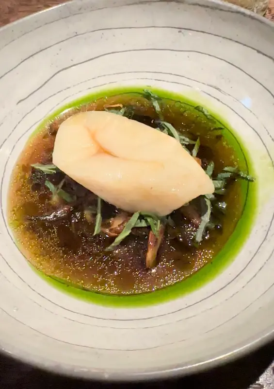 또 다른 요리 사진을 보면, 뽀얀 속살을 드러낸 생선 한 점이 초록색 오일과 함께 놓여 있습니다. 단순해 보이는 플레이팅이지만, 그 안에는 깊은 맛과 향이 숨겨져 있습니다. 마치 자연의 재료들이 캔버스 위에 펼쳐진 듯, 아름다운 색감과 조화로운 구성이 눈길을 사로잡습니다.