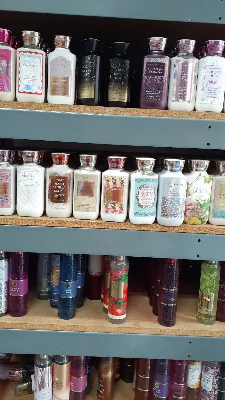 다양한 종류의 바디로션들이 층층이 진열되어 있어, 취향에 맞는 향과 효능을 가진 제품을 선택할 수 있습니다.
