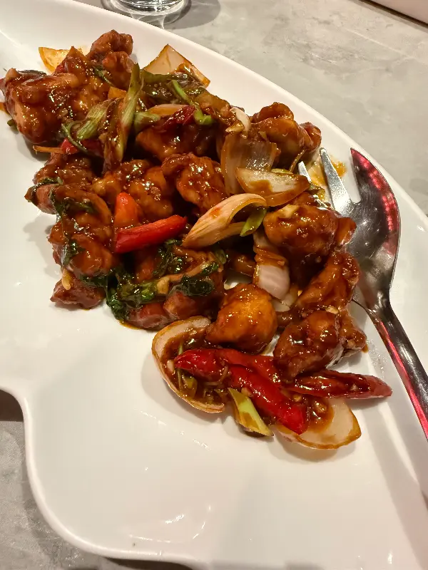 다음으로 크리스피 칠리 치킨이 나왔습니다. 겉은 바삭하고 속은 촉촉한 닭고기에 매콤한 칠리 소스가 어우러져 환상적인 맛을 자랑했습니다. 젓가락을 멈출 수 없는 중독적인 맛이었습니다.