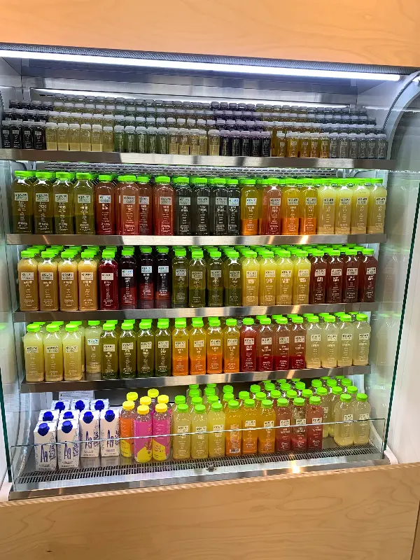 Pure Green의 깔끔하고 모던한 인테리어는 편안함을 선사합니다. 쇼케이스 안에는 신선한 재료로 만들어진 다양한 주스와 스무디가 가득합니다.