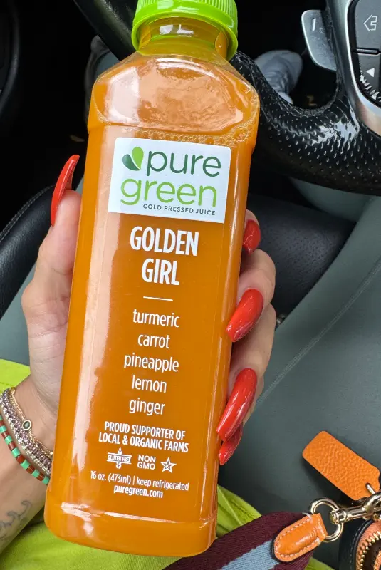 Golden Girl 주스는 터메릭, 당근, 파인애플, 레몬, 생강 등 몸에 좋은 재료들이 가득합니다. 운동 후 활력 충전에 도움이 됩니다.