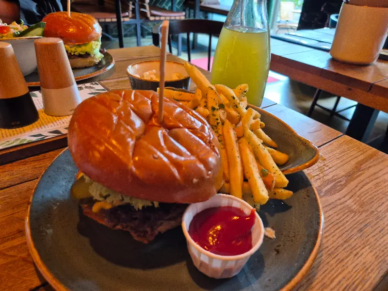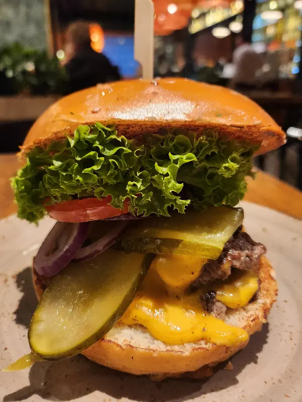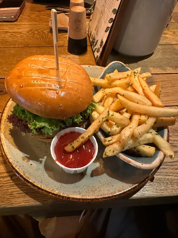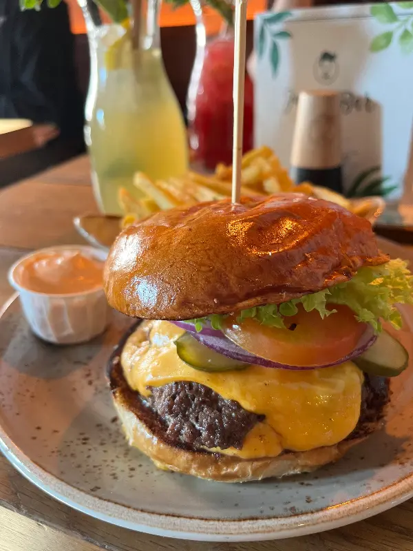 메뉴판을 훑어보며 고민한 끝에, 제이미 클래식 버거와 아펠바인을 주문했다. 잠시 후, 테이블 위에 놓인 버거의 웅장한 비주얼에 감탄했다. 윤기가 흐르는 빵과 신선한 채소, 두툼한 패티가 완벽한 조화를 이루고 있었다.