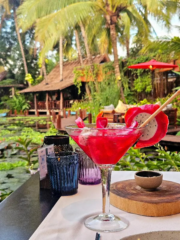 연못을 배경으로 놓인 테이블 위에 놓인 칵테일은 그 자체로 한 폭의 그림 같습니다. 특별한 날을 기념하기에 더없이 완벽한 분위기입니다.
