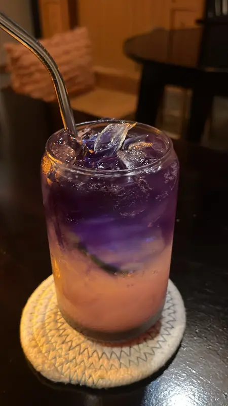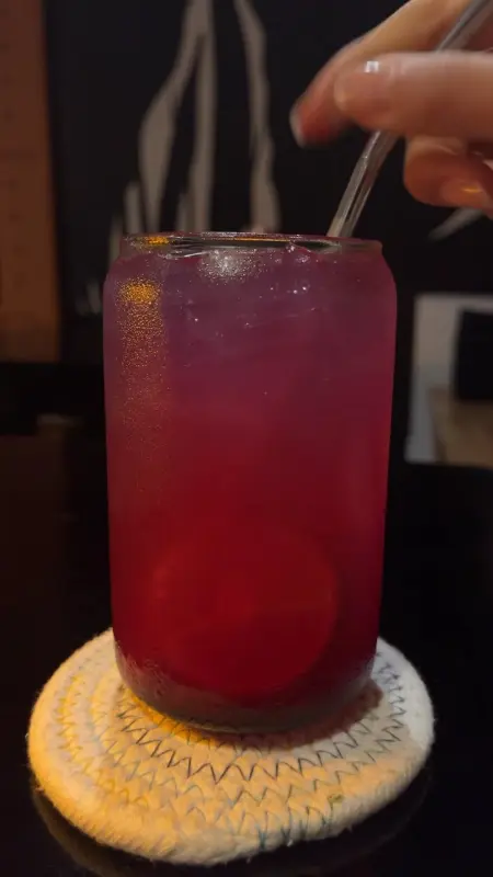 고심 끝에 몇 가지 메뉴를 주문했다. 가장 먼저 눈길을 사로잡은 것은 화려한 색감의 음료였다. 투명한 잔에 담긴 음료는 보랏빛과 붉은빛이 오묘하게 섞여 신비로운 분위기를 자아냈다. 한 모금 마시니, 달콤하면서도 상큼한 맛이 입안 가득 퍼져 나갔다. 신 것을 잘 못 먹는 사람에게는 다소 강하게 느껴질 수도 있지만, 라오스의 더위를 잊게 해주는 청량함이 매력적이었다.