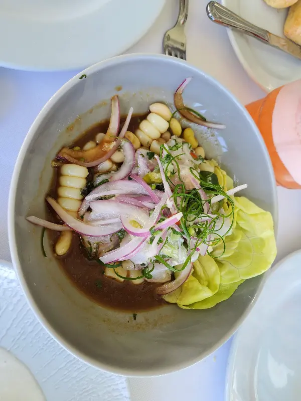 가장 먼저 나온 세비체는 신선한 해산물과 상큼한 소스의 조화가 돋보이는 요리였습니다. 톡 쏘는 듯한 라임 향과 신선한 해산물의 조화는 입맛을 돋우기에 충분했습니다. 하지만 일부 방문객들은 세비체가 다소 실망스러웠다는 의견도 있었습니다. 호불호가 갈릴 수 있다는 점을 참고하면 좋을 것 같습니다.